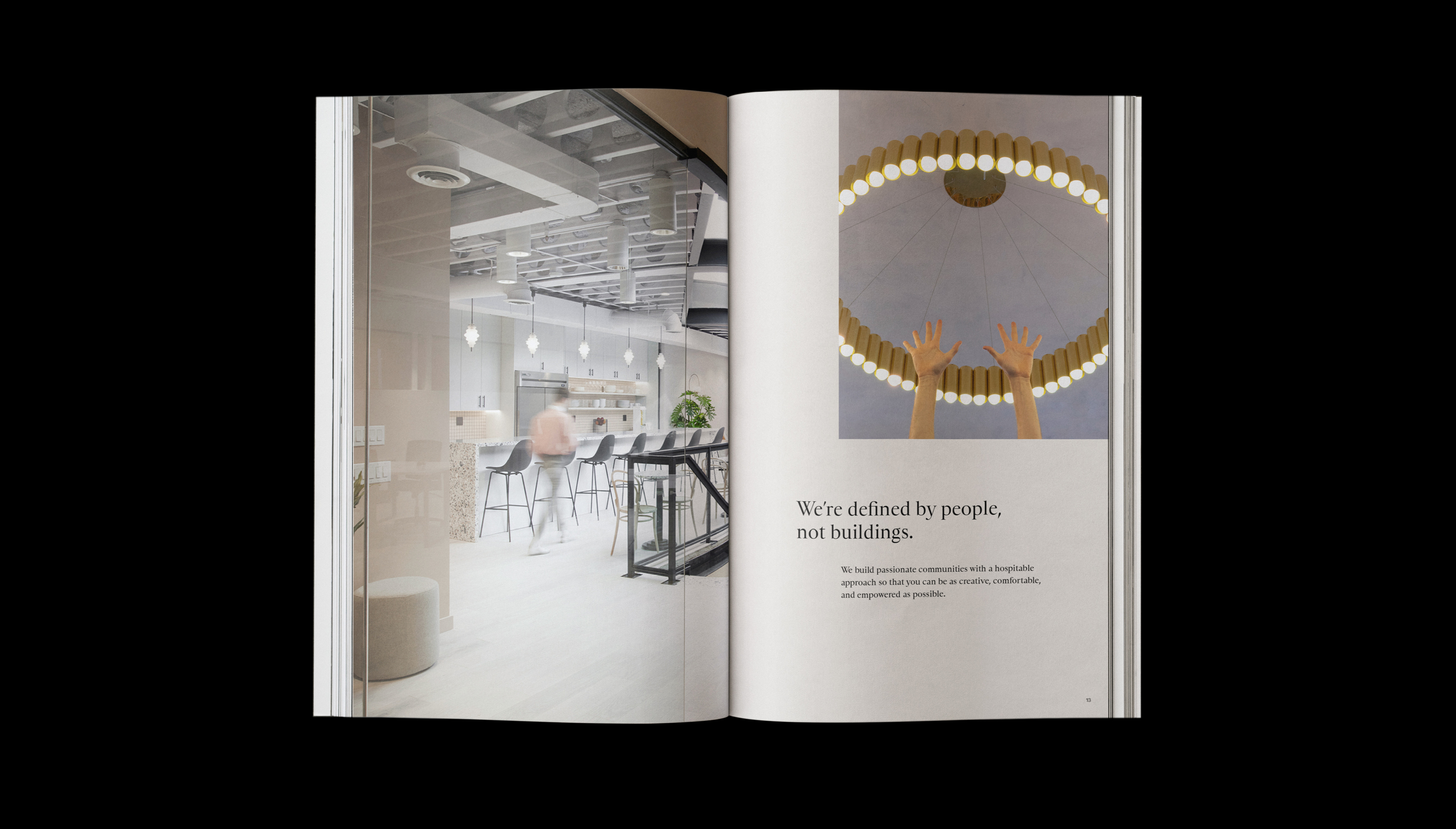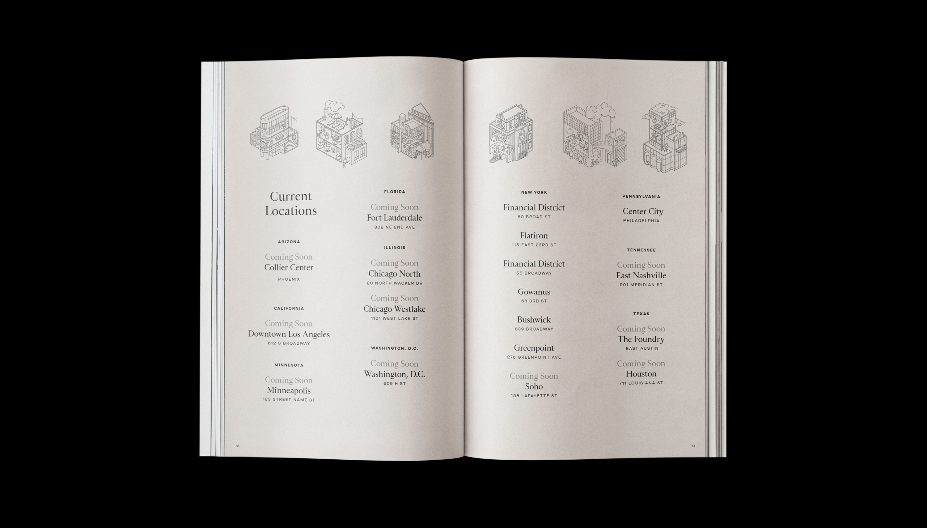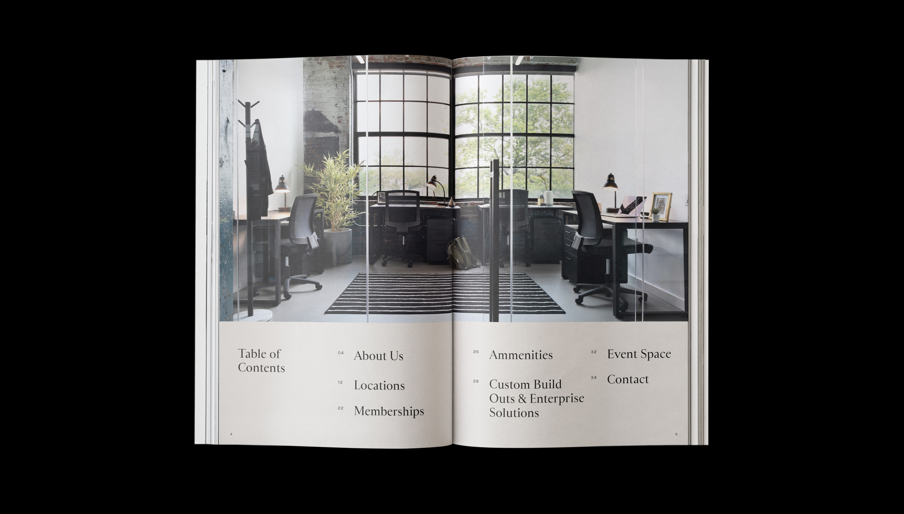 A property book was designed to attract new businesses and individuals to join. It captured brand ethos and provided an in-depth outline of the types of spaces and locations. The cover was inspired by composition notebook, reimagined with a linen cover and contrasting spine.